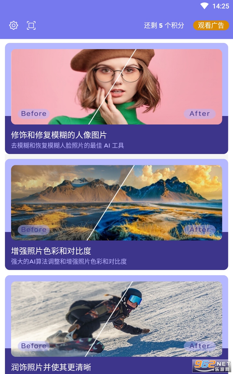 智能色彩增强。使用 AI 技术提高照片质量,以更好的色彩和对比度增强照片