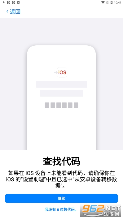 在 iOS 设备上,点击“从安卓设备转移数据”屏幕上的“继续”。然后等待十位或六位数字的代码出现。如果安卓设备显示“您的互联网连接信号弱”的警告,可以忽略这条警告。