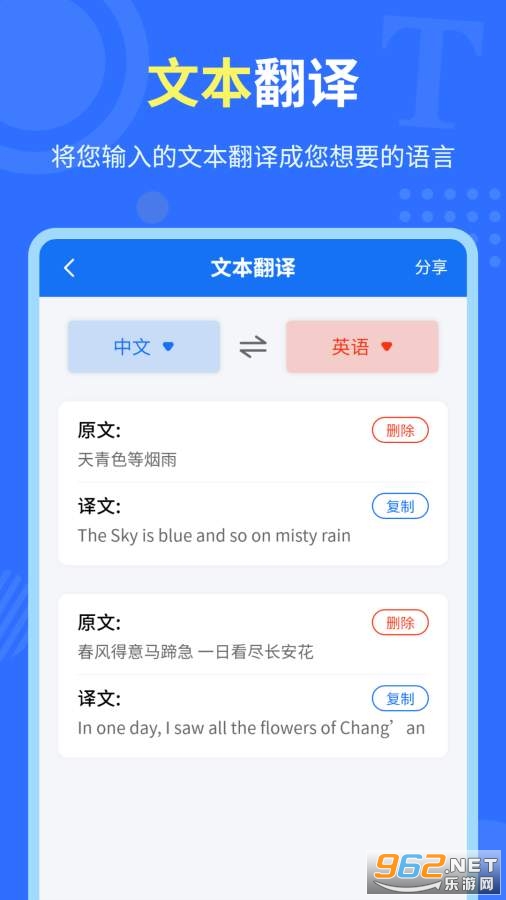 《中英互译官app》是一款为朋友们打造的中英翻译软件,操作非常的简单,我们只需要将需要翻译文本复制到软件中,然后选择目标语言即可翻译成对应的语言,你还可以直接拍照来进行翻译,简单方便。
