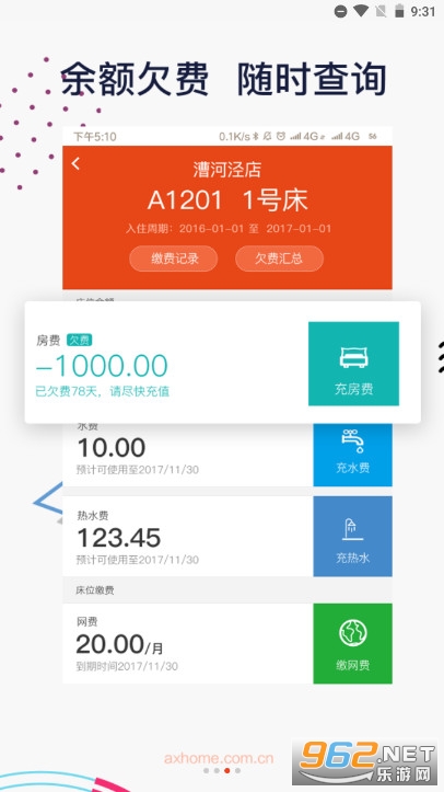 2、随时查询房费、水费、电费,网费余额欠费等情况,及时在线进行缴纳。