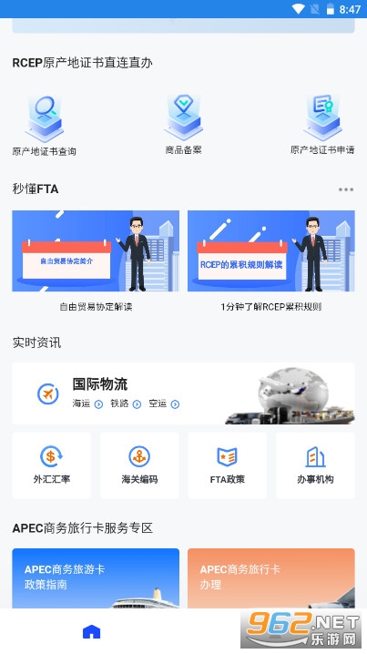 FTA惠企一键通智慧平台APP新增上线CPTPP、USMCA等全球重点FTA查询,实现全种类原产地证书在线办理,集成一站式海陆空国际物流班次查询,全新打造“秒懂FTA”系列宣讲视频,推出出口产品“碳足迹”测算服务,切实服务企业会享FTA,享惠FTA。