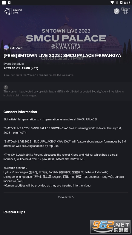 1、在线进行sm娱乐公司旗下艺人的线上演唱会的观看并与粉丝们一起进行实时聊天应援