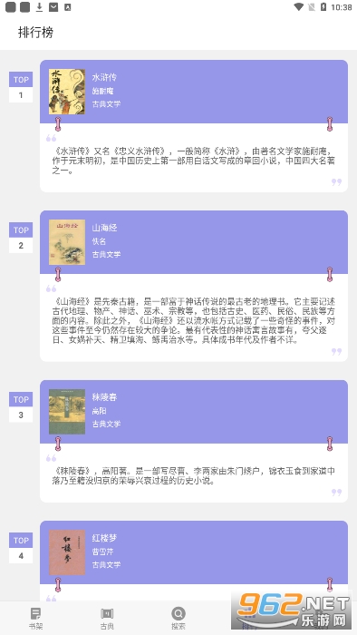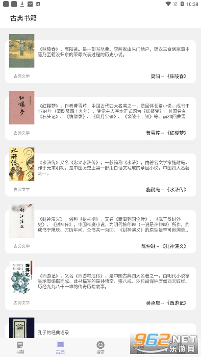 四大名著包括《西游记》,《水浒传》,《三国演义》与《红楼梦》。不少人都爱不释手,耳熟能详。为了配合《四大名着》的阅读与鉴赏,也收录了另外20部中国经典著作等。该电子书是为喜欢阅读学习研究中国古典名著的安卓手机用户设计的,所有名著都放在了设备端,完全离线阅读,不受有无网络的限制,阅读体验很好。