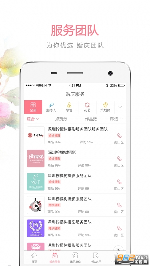 2.应用提供线上查找补贴示范单位以及婚庆行业服务团队的联系方式。