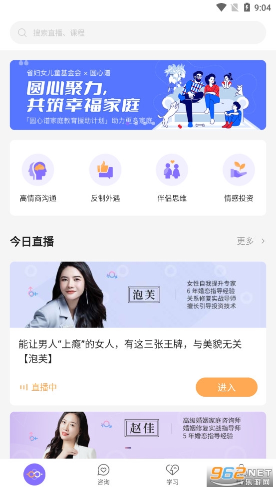 家庭情感服务平台,有着众多的情感课程可以学习,提高自己处理家庭婚姻感情问题的能力,可以在线咨询等,帮助你解决生活中遇到的问题,有需要的朋友可以下载试试。
