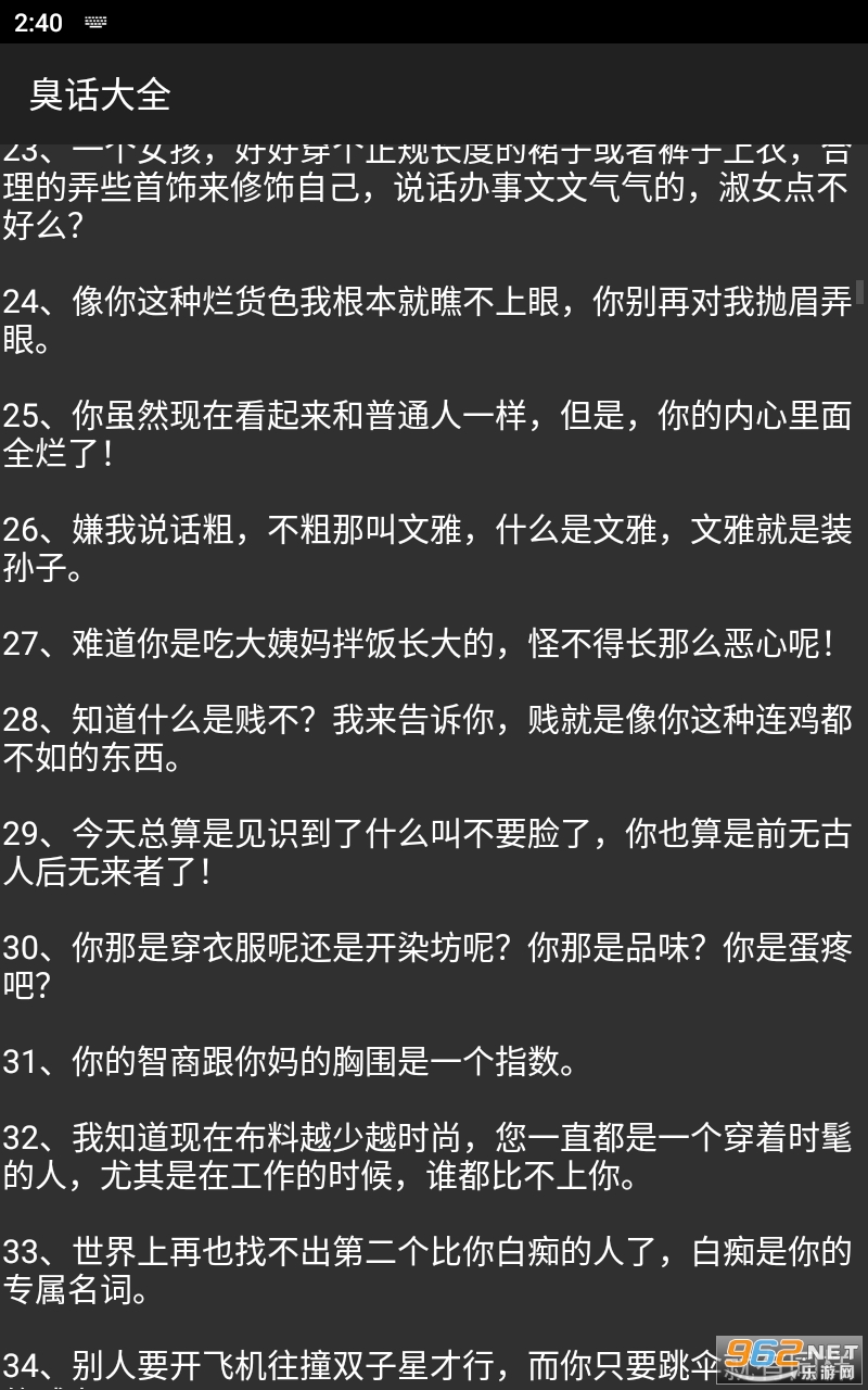 臭话大全app是一款叫你话术的软件,在各种场合下如何与别人对话如何去正确的交流,有时候可以用来活跃气氛,也有些时候可以用来怼人,囊括了超多精彩有趣的怼人句子,是可以面对不同人群进行使用的,上面有上万条经典话术,大家可以学习一下,需要的话请直接点击下载吧。