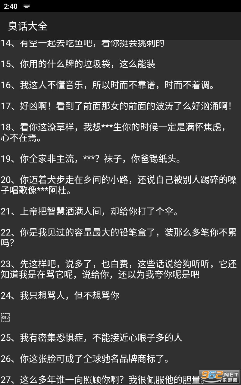 《臭话大全app》是一款很小巧的怼人神器软件,在网上和人互怼的时候非常的方便,生成各种有趣的不带脏字的怼人句子,看上去非常的搞笑,而且只需要一件点击生成然后进行复制即可,感兴趣的亲们赶紧下载吧。