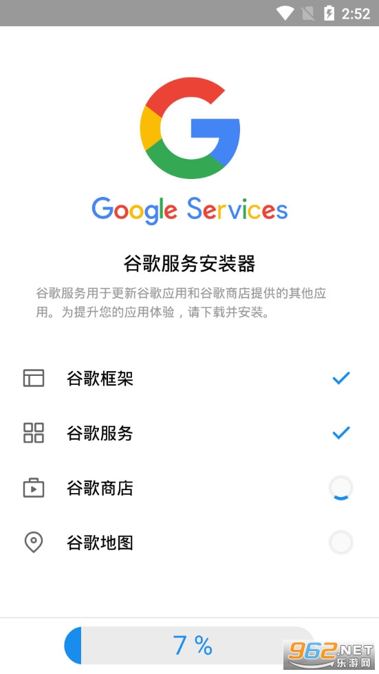 1、点击"一键安装"后,分别下载和安装谷歌框架、谷歌服务、谷歌商店;
