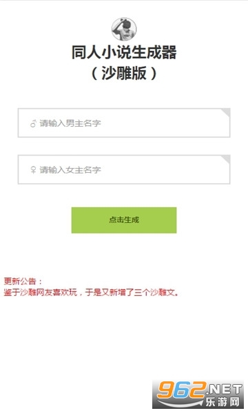只需要输入你想要的名字,就可以生成各种不同的同人文。操作起来很简单,适合用来打发时间,也可以看看不同的同人文故事,还挺有趣的,快来下载试试吧!