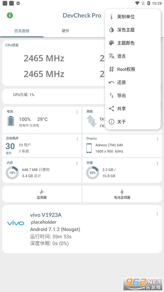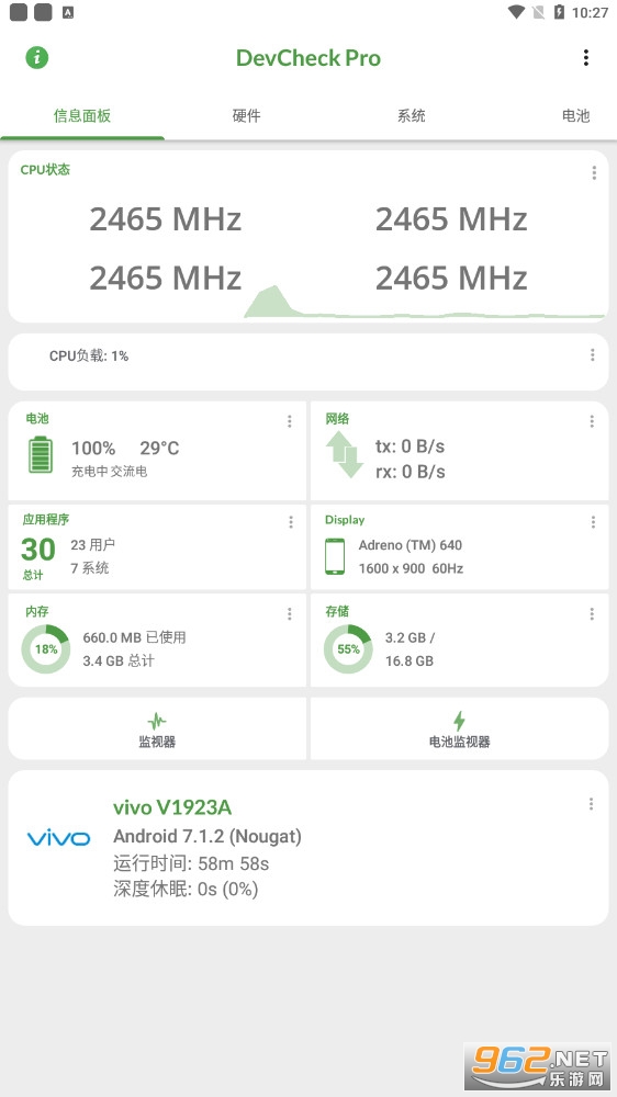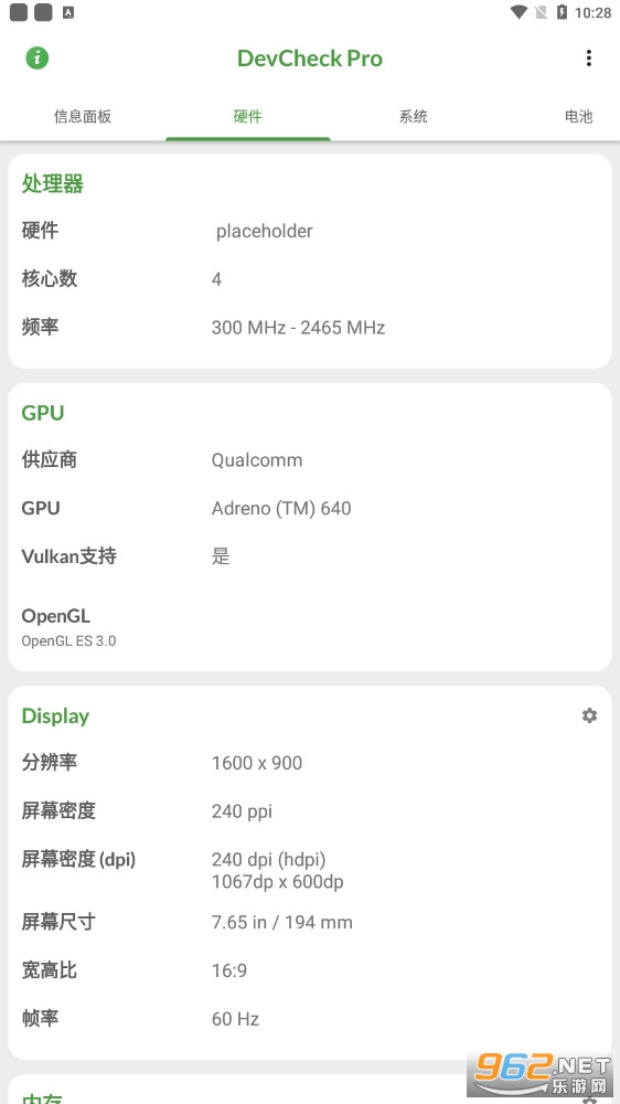 DevCheck能够快速检测手机的各项硬件信息,监控手机硬件的运行状态,软件信息简洁明了,是款相当直观明了的手机硬件信息检测查看工具,各种硬件详细参数一览无余,让您随时随地查看和监控自己手机硬件信息及运行情况,或者用来检验山寨机都是很不错。