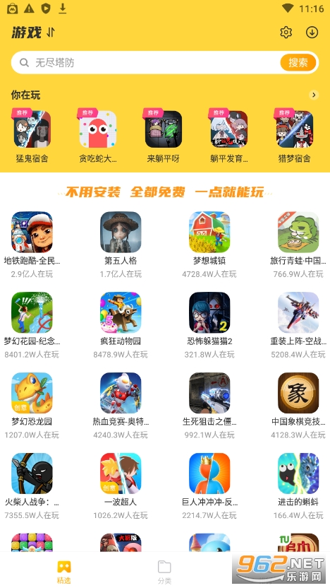 2、不同类型的游戏进行了详细的划分,你可以直接进入自己感兴趣的页面,线上就可以试玩;