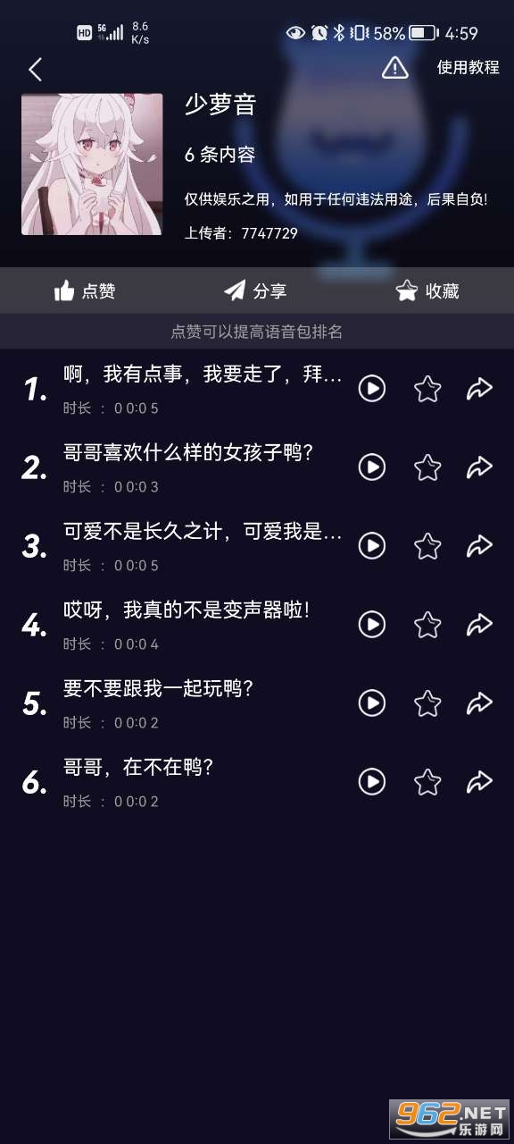 内含精品语音包,素材包括李云龙、小猪佩奇、萝莉,等精品语音包,还有男变女、女变男、大叔变萝莉、小孩变型男等实时变声功能