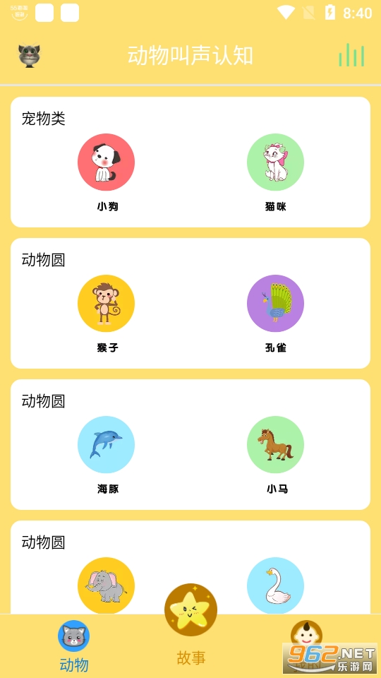 宝宝们能够通过软件接触各种不同的故事以及儿歌,还能够模拟动物的各种叫声,操作方式简单,界面也很清新,快来下载吧!