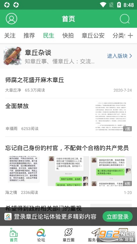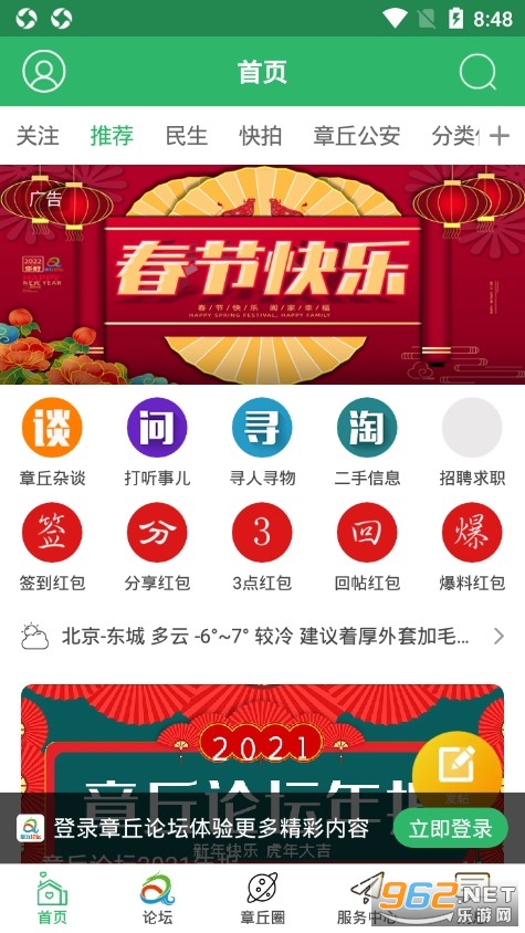 章丘论坛是一款专为章丘市打造的网络社区服务应用软件,章丘论坛app为用户提供了非常便捷的生活服务,包含了民生服务、衣食住行、二手交易、招聘、租房等方面。