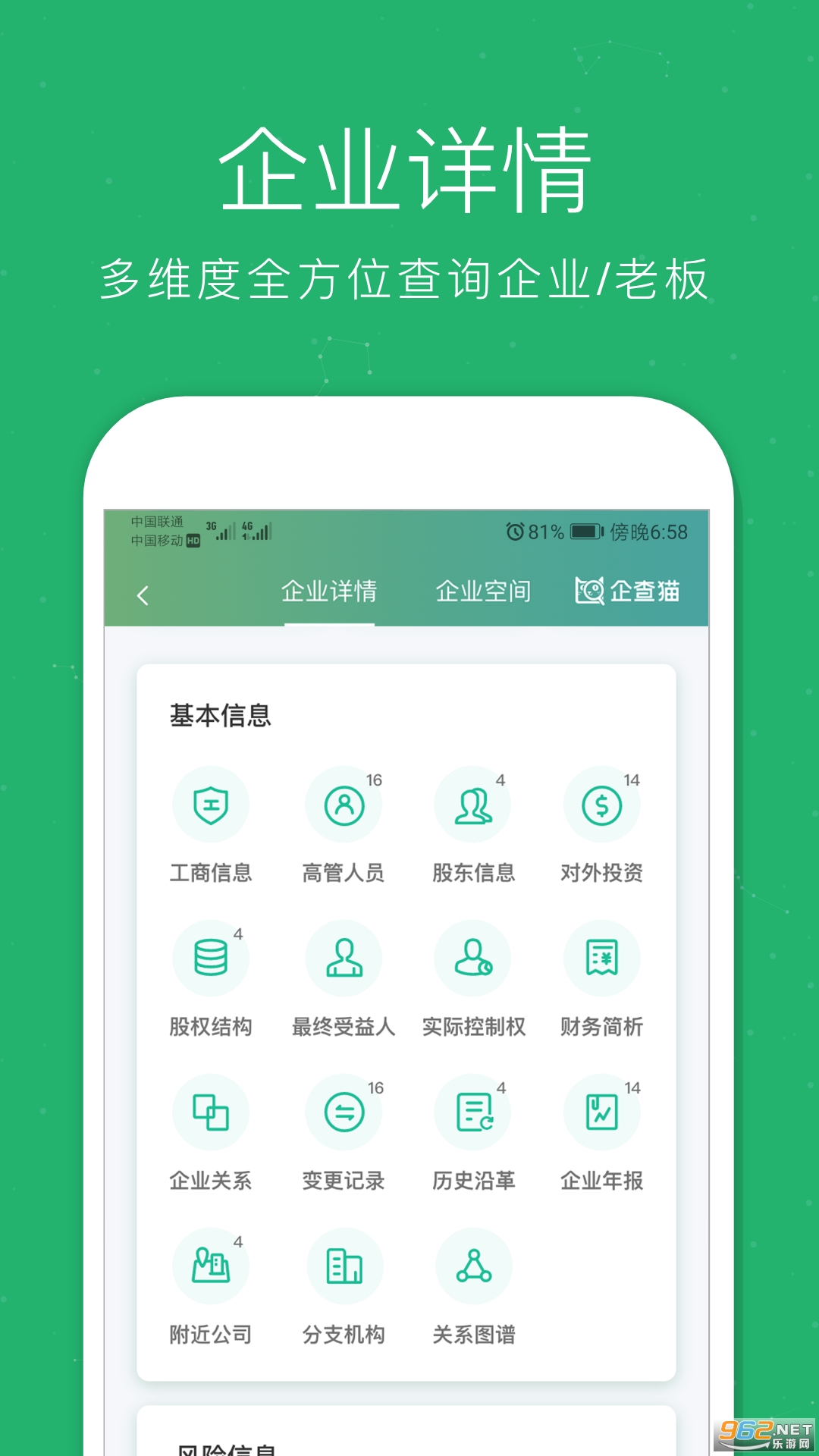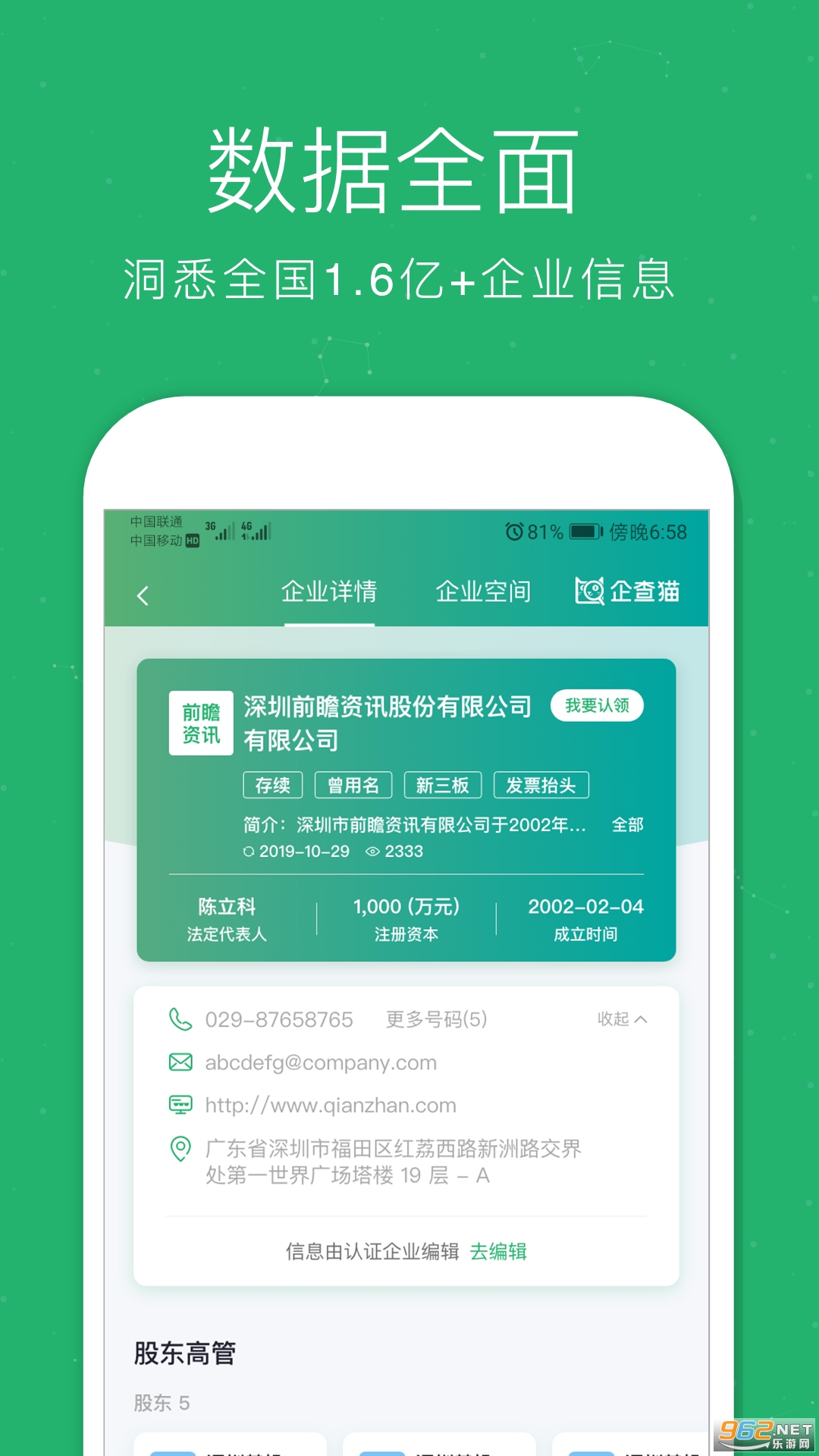 企查猫是一款可以快速查询企业和企业老板工商背景信息的强大企业查询工具。覆盖全国1.6亿+企业信息,为用户提供全面有效的企业大数据查询。只要输入需要检索的企业名或人名,就可快速查到企业的工商信息、联系方式、股东高管、股权结构、对外投资、商标专利、司法诉讼、信用状况、关系图谱、发票查询、变更状况、招聘信息、行政处罚等。