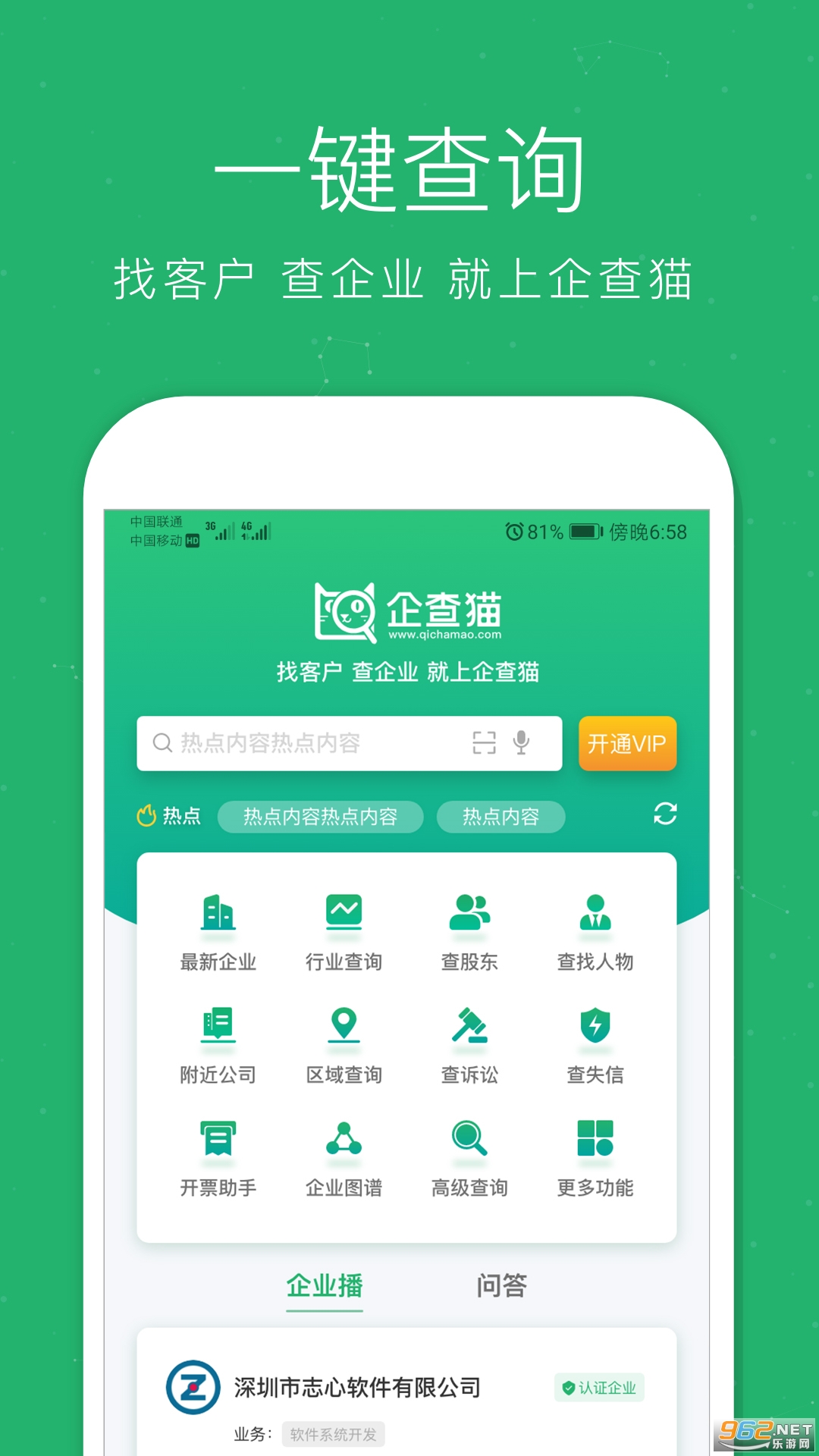 1.企业查询:支持智能搜索公司名称或人名等关键字,一键搜索企业和老板。