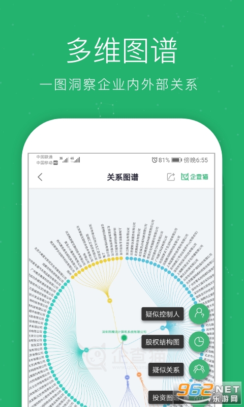 2.企业图谱:利用大数据挖掘技术,一键生成企业关系链图,直观显示企业之间的投资关系,股东关系等多维信息。