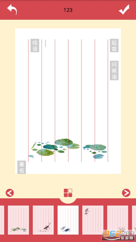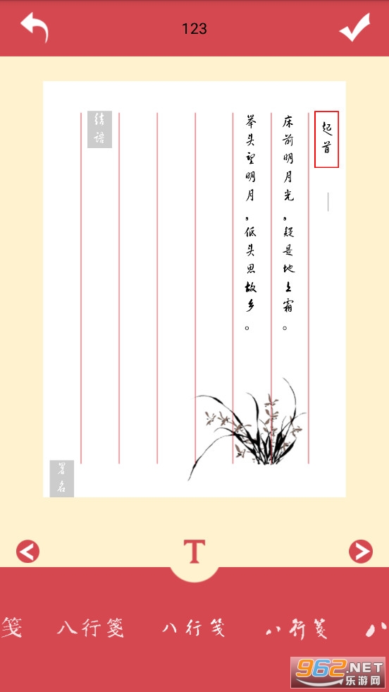以古代书信的方式表达言语,从左到右以列排布。有13种图纸,6种字体。但是注意,可能打字时会闪退;并且写的字写不了最后一列。