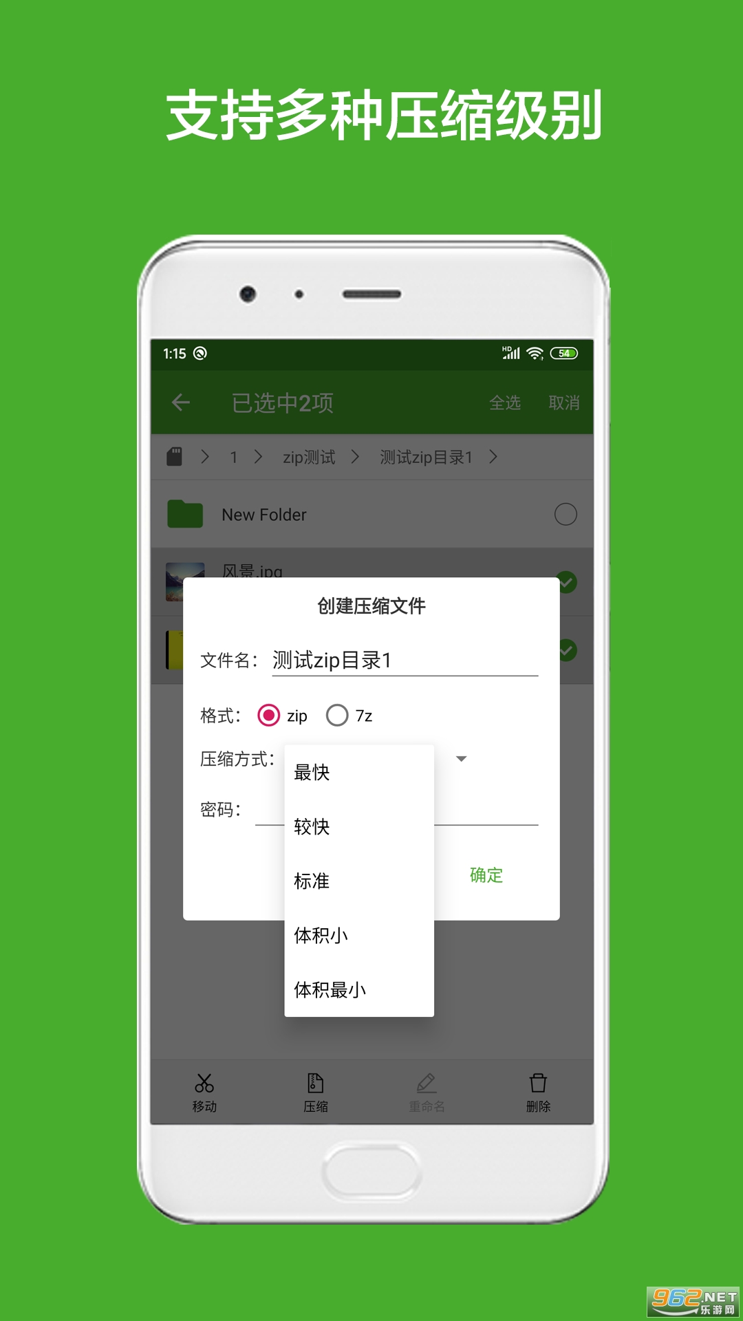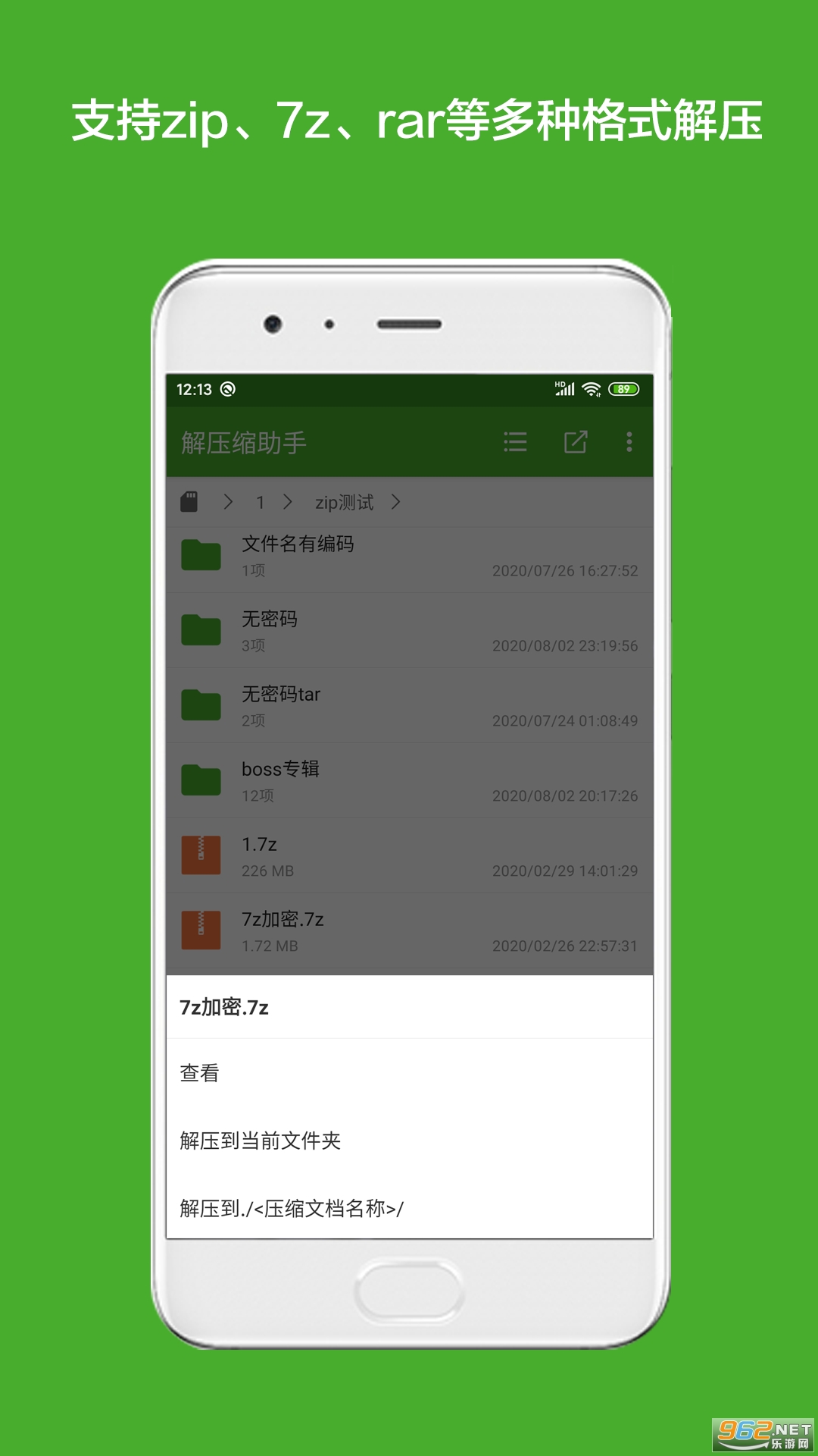 支持zip和7z两种格式的压缩。解压格式全,解压速度快。