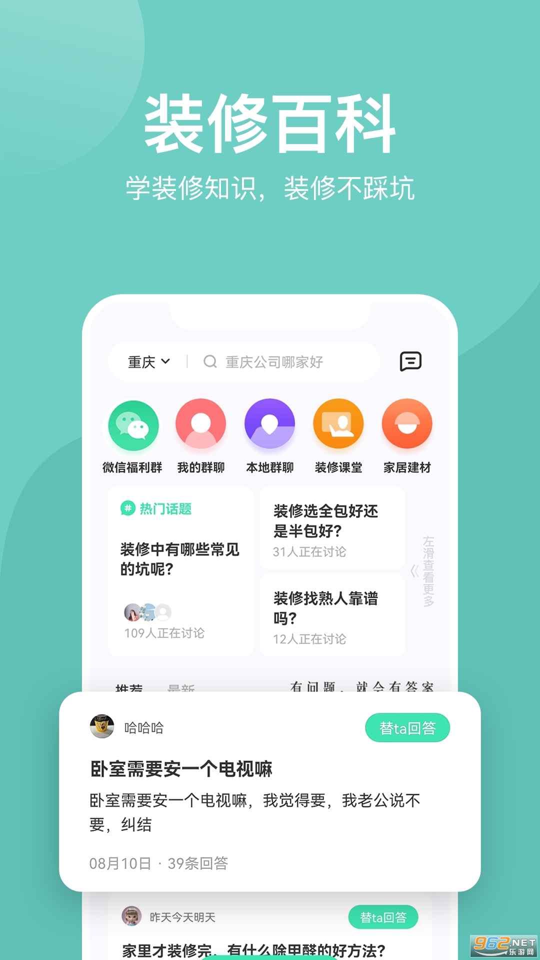 【在线提问交流】 与同期装修业主在线交流,发布装修疑问,交流真实装修经历,找到答案,从装修小白轻松入门装修。装修设计、建材知识、施工工艺、选择公司,装修过程中所有的装修细节你都能从亲身经历过的装修业主身上获取。更贴近现实,真实具体,可信度更高!