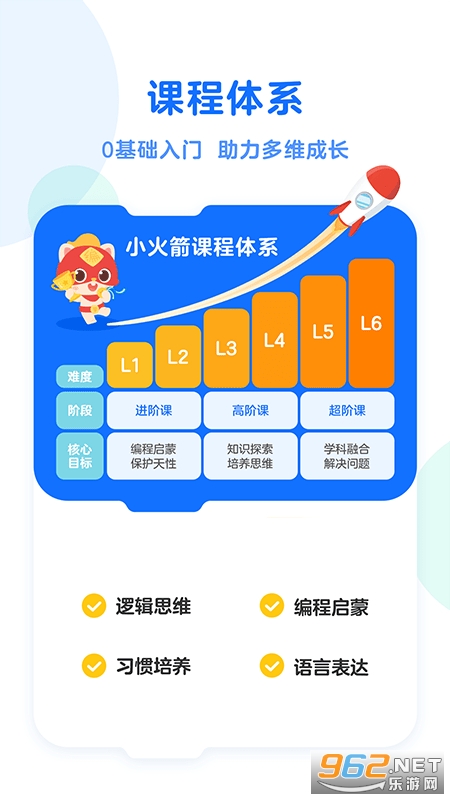 小火箭幼儿编程,是编程猫旗下的幼儿启蒙课,手机就能学编程、学思维!其中编程启蒙课程,将编程知识、Steam等多种知识紧密结合,并将知识点融进剧情故事内,在趣味横生的课堂中提高编程能力、锻炼数理思维。