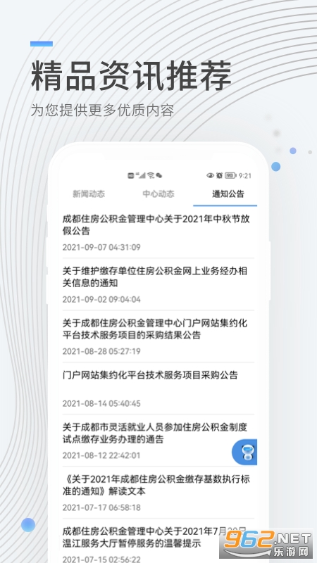 『新闻资讯』新闻动态、中心动态、通知公告,方便缴存职工随时随地了解住房公积金讯息。