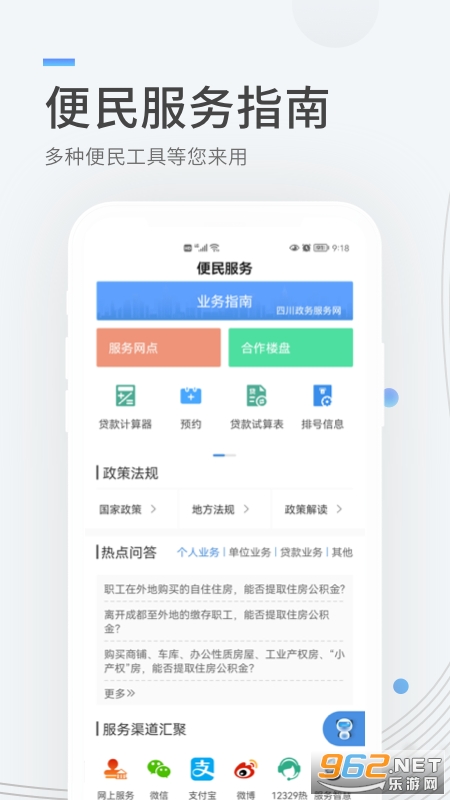 『便民服务』业务指南、服务网点、合作楼盘、政策法规、热点问答,还有多种便民工具供您使用。