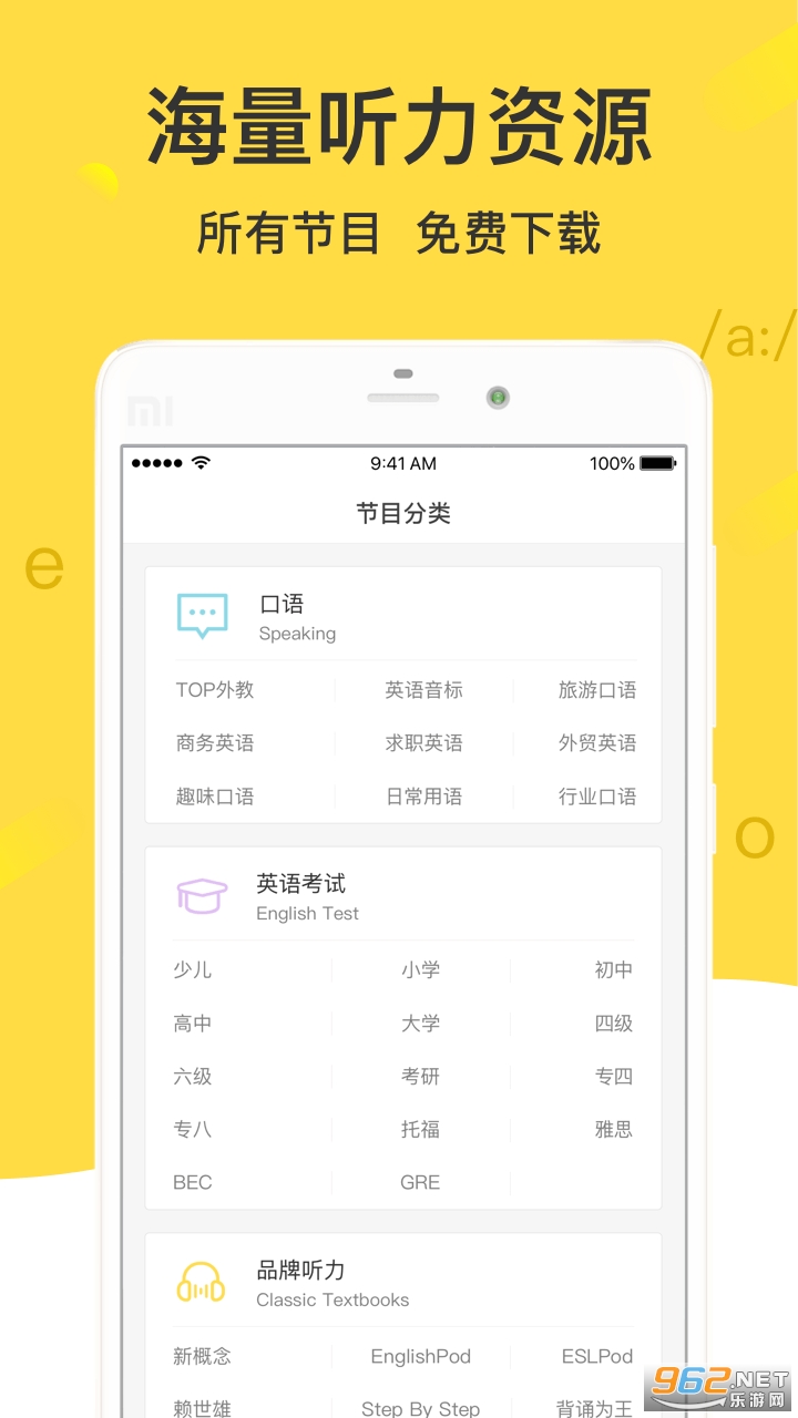 1.海量资源:VOA、BBC、美剧、音乐、名人演讲、商务职场、新概念等所有你能想到的资源