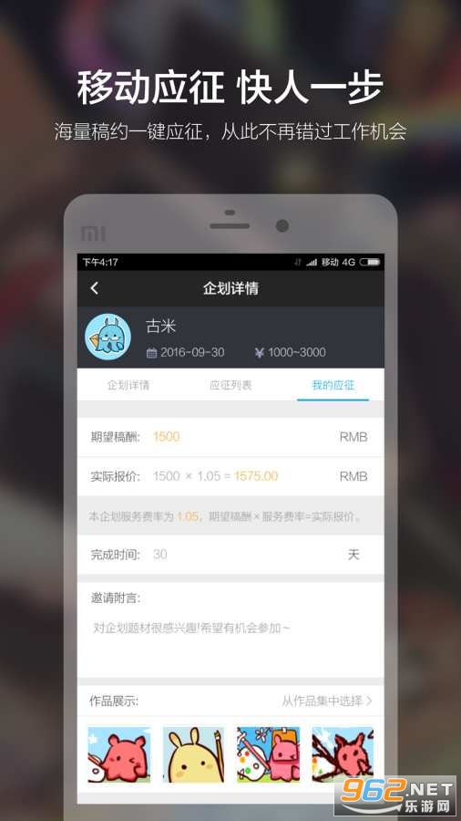 2、倍受画师期待的应征功能上线,现在你可以随时随地抢占工作机会,下载米画师APP,应征快人一步!