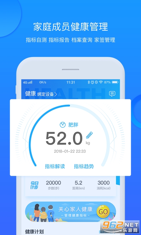 指标自测、指标报告、档案查询、家属管理。