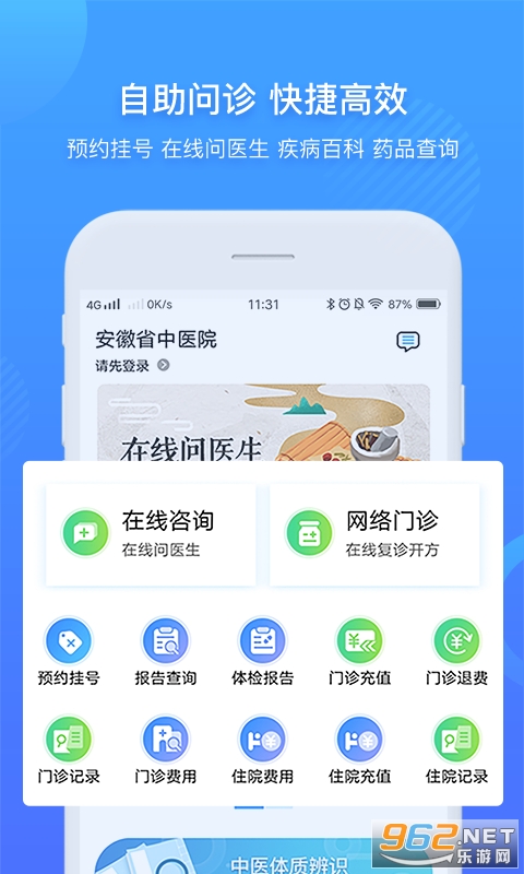 安徽省中医院公众端将医院信息系统整合延伸到手机,形成一个高效、实时、动态的医疗信息交互平台,为患者提供便捷的就诊服务,实现在线咨询(图文咨询、视频咨询、电话咨询)、预约挂号、门诊记录费用查询、报告单查询、充值就诊卡等功能,改善患者就医体验,提高医院工作效率。
