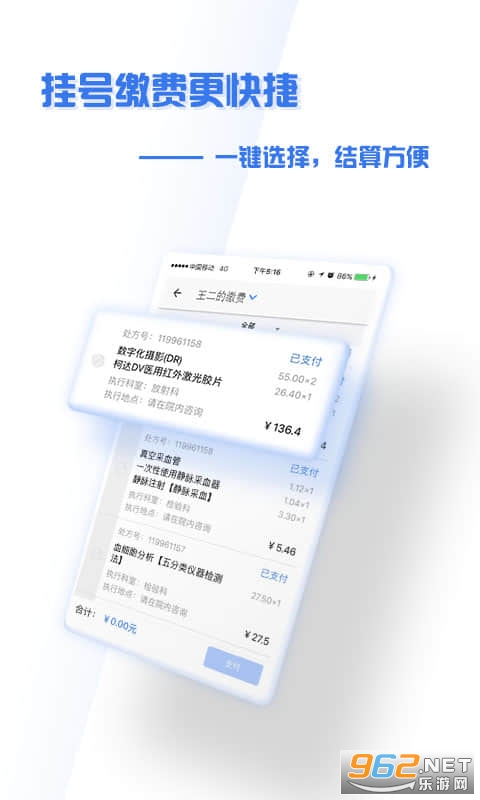 3、手机查看检验检查结果(部分检验结果APP上不可查看)。随时随地查看您的就诊历史信息以及检验检查的详细情况,轻松便捷!