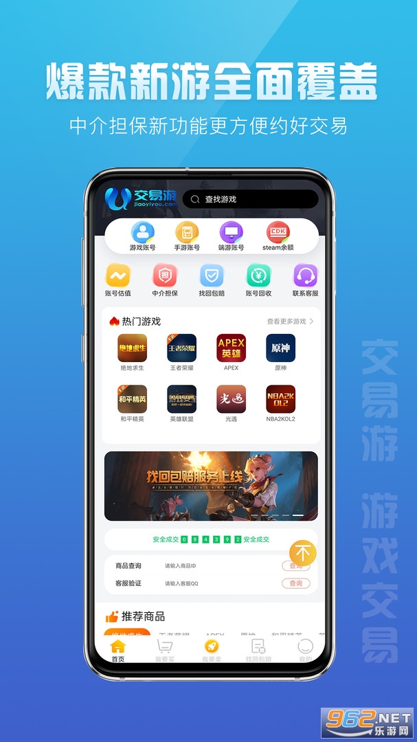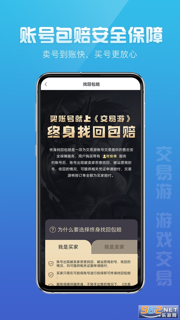 《交易游游戏交易平台》是一款非常好用专业的游戏租号平台,这里为用户提供最好最棒的账号买卖和租聘服务,操作也方便,各种初始号,自抽号,成品号任你选择,包含多款游戏,感兴趣的朋友还在等什么?欢迎来962下载!