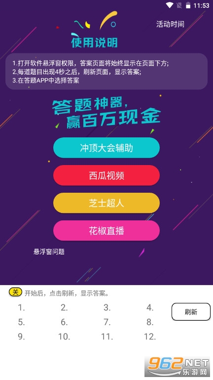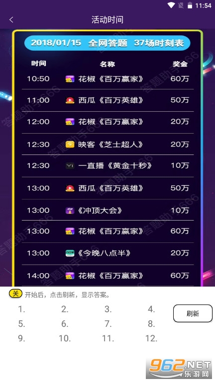2、每天下午1点,晚上8点,准时开始,12道单项选择题,全部答对的所有人,平分本场的奖金,每场奖金从几万元到几千万元不等,以当天的预告为准。