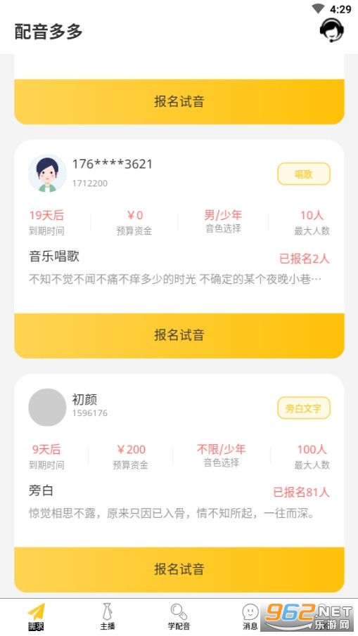 《配音多多》是一款高质量的配音服务平台,如果大家想找专业人士或者专业主播为自己配音的话可以来这里,各种声音任你挑选,并且价格还非常便宜,算是全网性价比最高的地方了,专业的配音软件做专业的事,用户们如果也想去学习一下配音的话,上面有一些课程你能够选择性报名去学习。