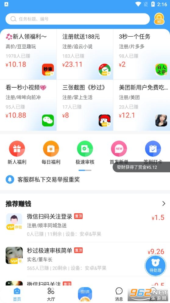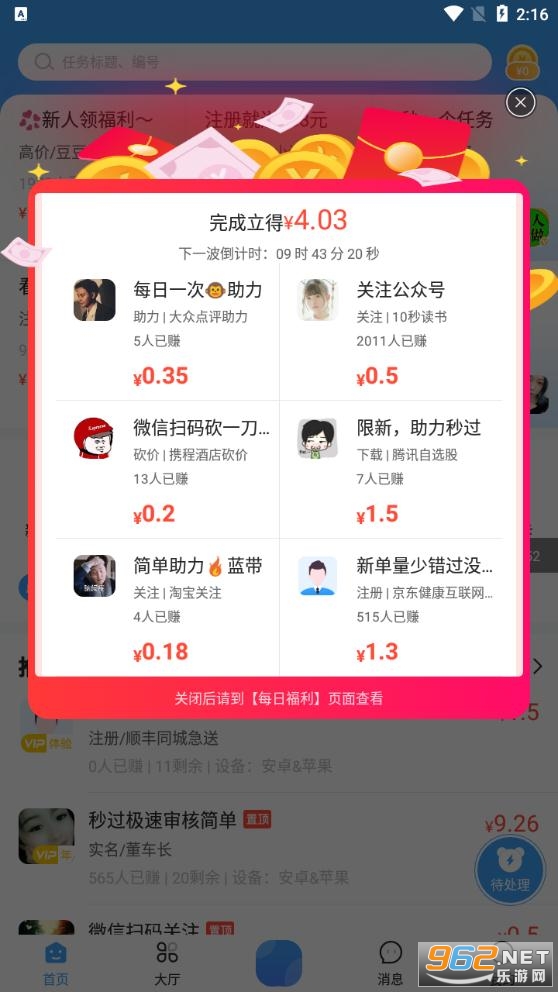 2.审核成功就可以开始赚钱了,这里大量的任务都可以随时领取!