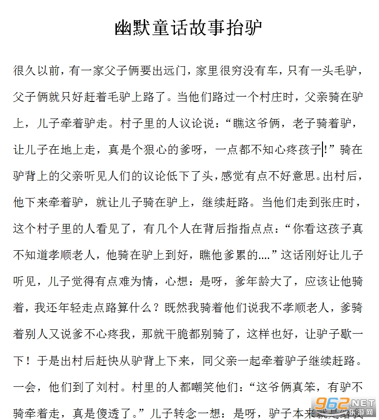 《幽默童话故事抬驴》是小编在网上收集到的一篇童话故事的范本,寓意鲜明,故事剧情紧凑,篇幅比较的短但是将故事以及寓意很好的展现在了读者的面前,是非常不错的一篇童话故事哦,感兴趣的亲们赶紧下载吧。