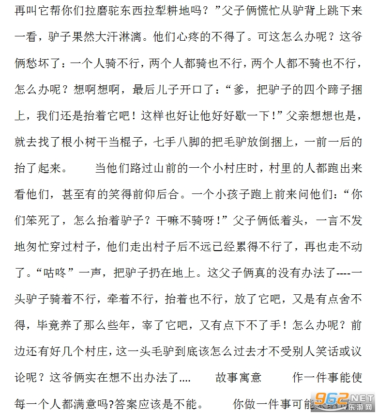 出村后,他下来牵着驴,就让儿子骑在驴上,继续赶路。当他们走到张庄时,这个村子里的人看见了,有几个人在背后指指点点:“你看这孩子真不知道孝顺老人,他骑在驴上到好,瞧他爹累的....”这话刚好让儿子听见,儿子觉得有点难为情,心想:是呀,爹年龄大了,应该让他骑着,我还年轻走点路算什么?既然我骑着他们说我不孝顺老人,爹骑着别人又说爹不心疼我,那就干脆都别骑了,这样也好,让驴子歇一下!于是出村后赶快从驴背上下来,同父亲一起牵着驴子继续赶路。一会,他们到了刘村。村里的人都嘲笑他们:“这爷俩真笨,有驴不骑牵着走,真是傻透了。”儿子转念一想:是呀,驴子本来就是给我们做一些事情方便用的,怎么牵着不骑呢?出村后,父子俩商量了一下:既然一个人骑驴一个人步行,骑驴的总被别人说,干脆咱们爷儿俩都骑上吧。于是,父子俩兴高采烈的骑上驴,谁知没走多远就把小毛驴累得气喘嘘嘘满身大汗。尽管这样他们也没注意到。