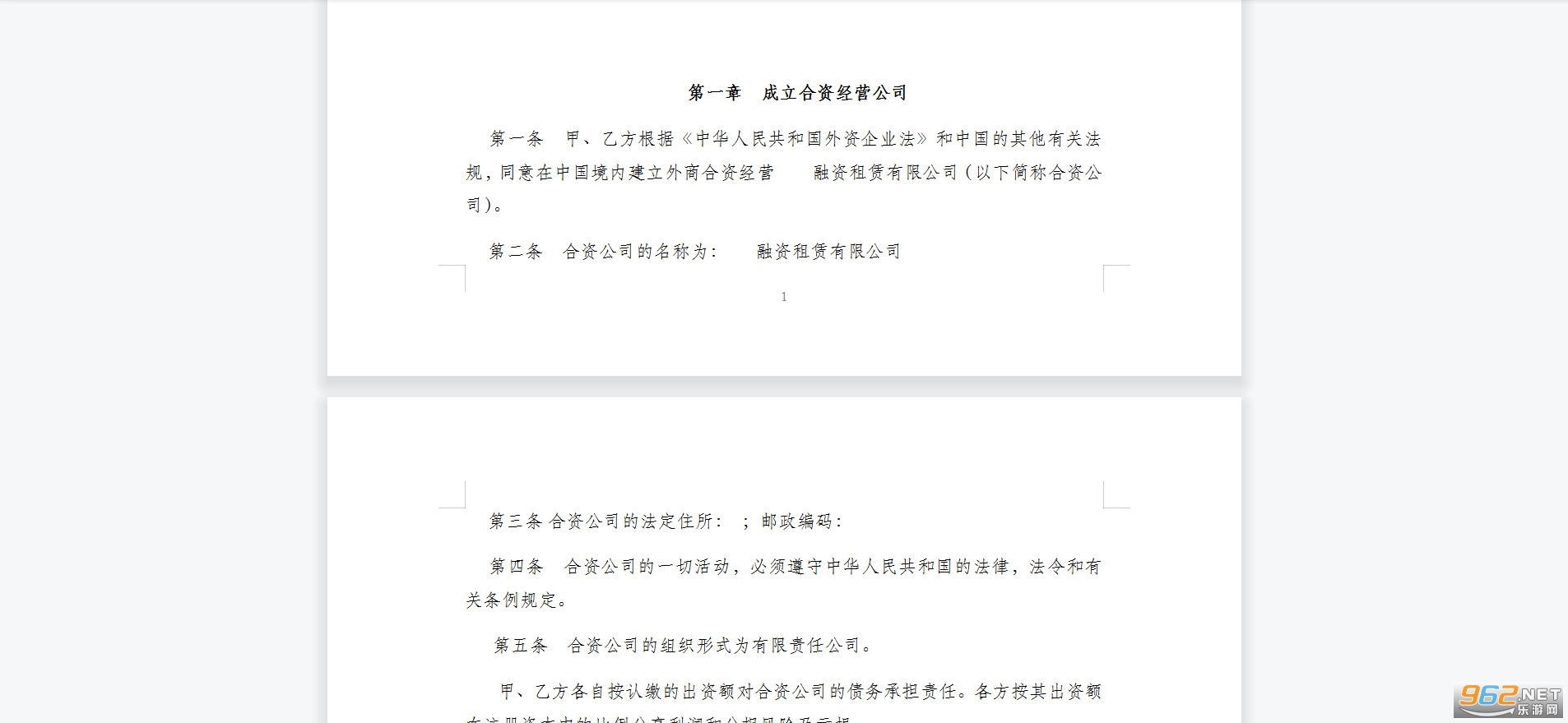 第一条 甲、乙方根据《中华人民共和国外资企业法》和中国的其他有关法规,同意在中国境内建立外商合资经营 融资租赁有限公司(以下简称合资公司)。