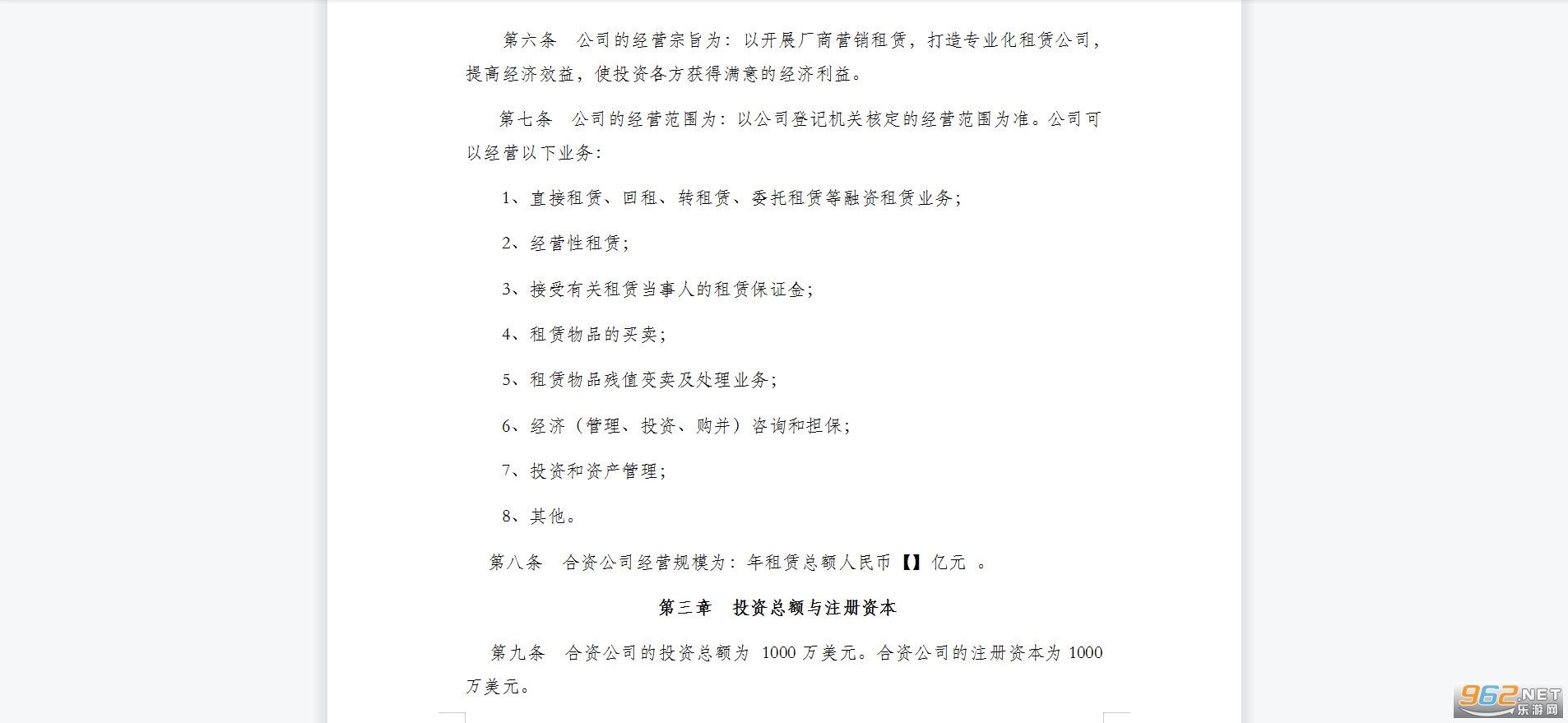 第八条 合资公司经营规模为:年租赁总额人民币【】亿元 。