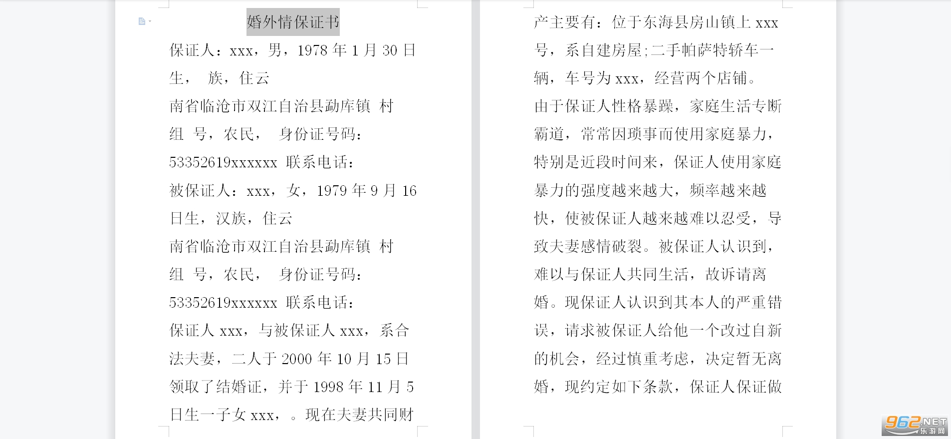 婚外情保证书范文: