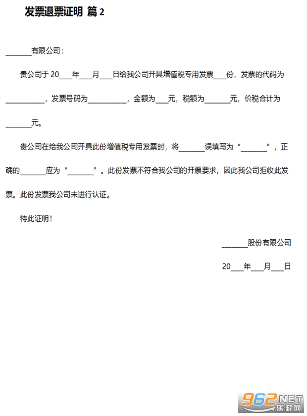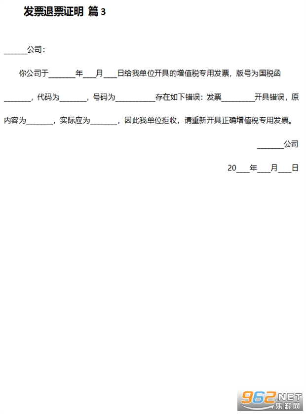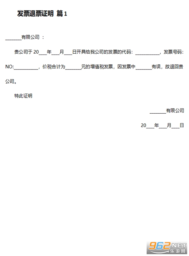 贵公司于20____年____月____日开具给我公司的发票的代码:____________,发票号码:NO:____________,价税合计为________元的增值税发票,因发票中________有误,故退回贵公司。