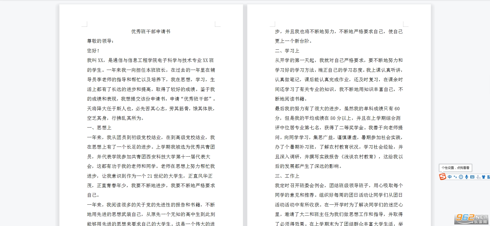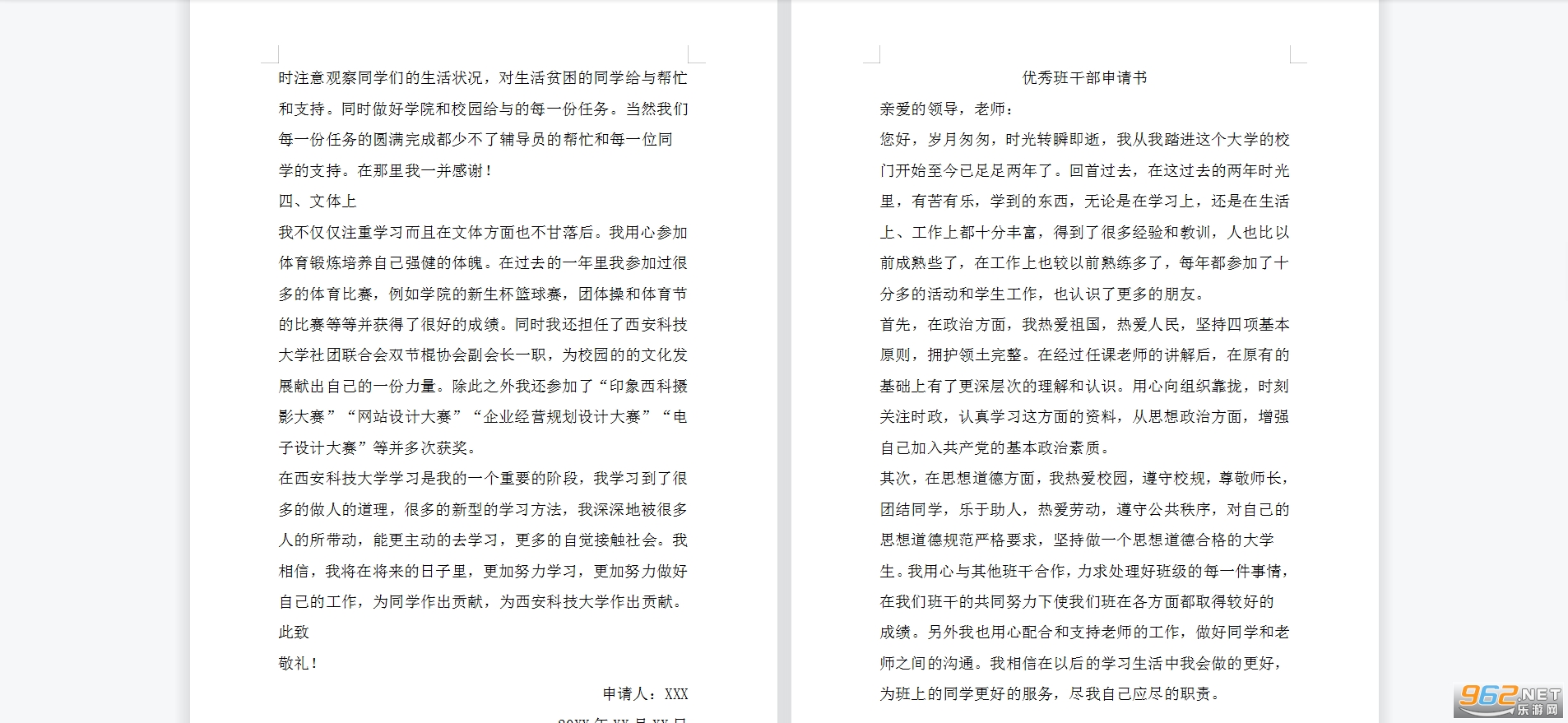 我叫XX,是通信与信息工程学院电子科学与技术专业XX班的学生。一年来我一向担任本班班长,在过去的一年里在辅导员李老师的指导和帮忙以及培养下,我在思想,学习,生活上都有了长远的进步和提高,取得了较好的成绩。鉴于我的成绩和表现,我想提交该份申请书,申请“优秀班干部”。