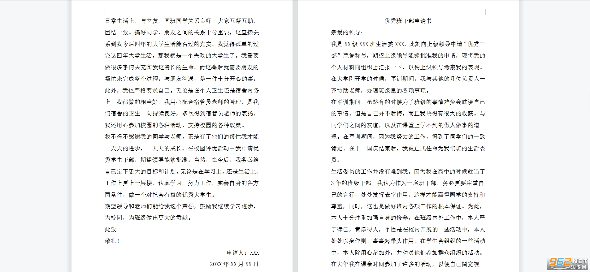 我是XX级XXX班生活委XXX,此刻向上级领导申请“优秀干部”荣誉称号,期望上级领导能够批准我的申请,现将我的个人材料向组织上汇报一下,以便上级领导考察我的表现。