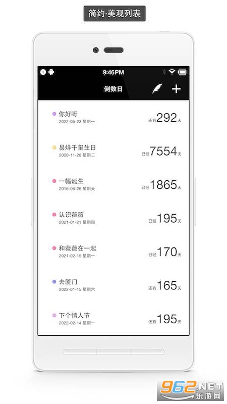 一款非常好用的日期提示软件,通过这款软件让你了解每一个重要日子的到来,完成各种各样的规划,软件的操作简单容易上手,还有着多种不同的功能,各种各样的标签,没有任何广告,有需要的就快来试试吧。