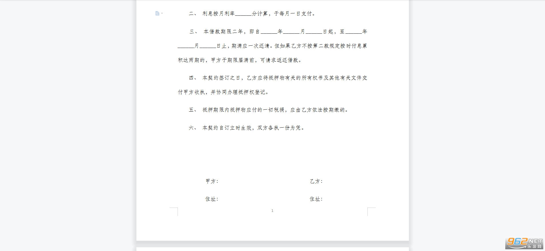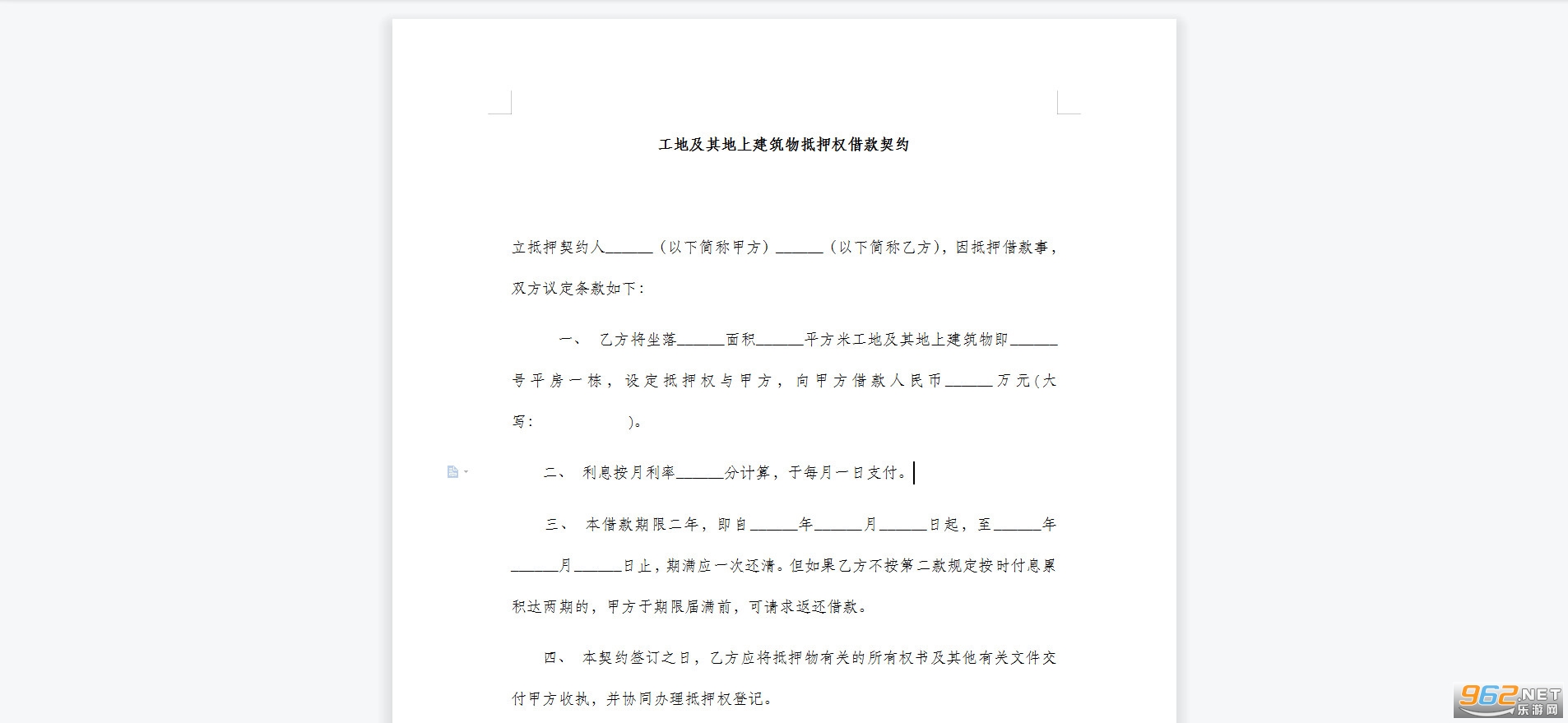 一、 乙方将坐落______面积______平方米工地及其地上建筑物即______号平房一栋,设定抵押权与甲方,向甲方借款人民币______万元(大写: )。