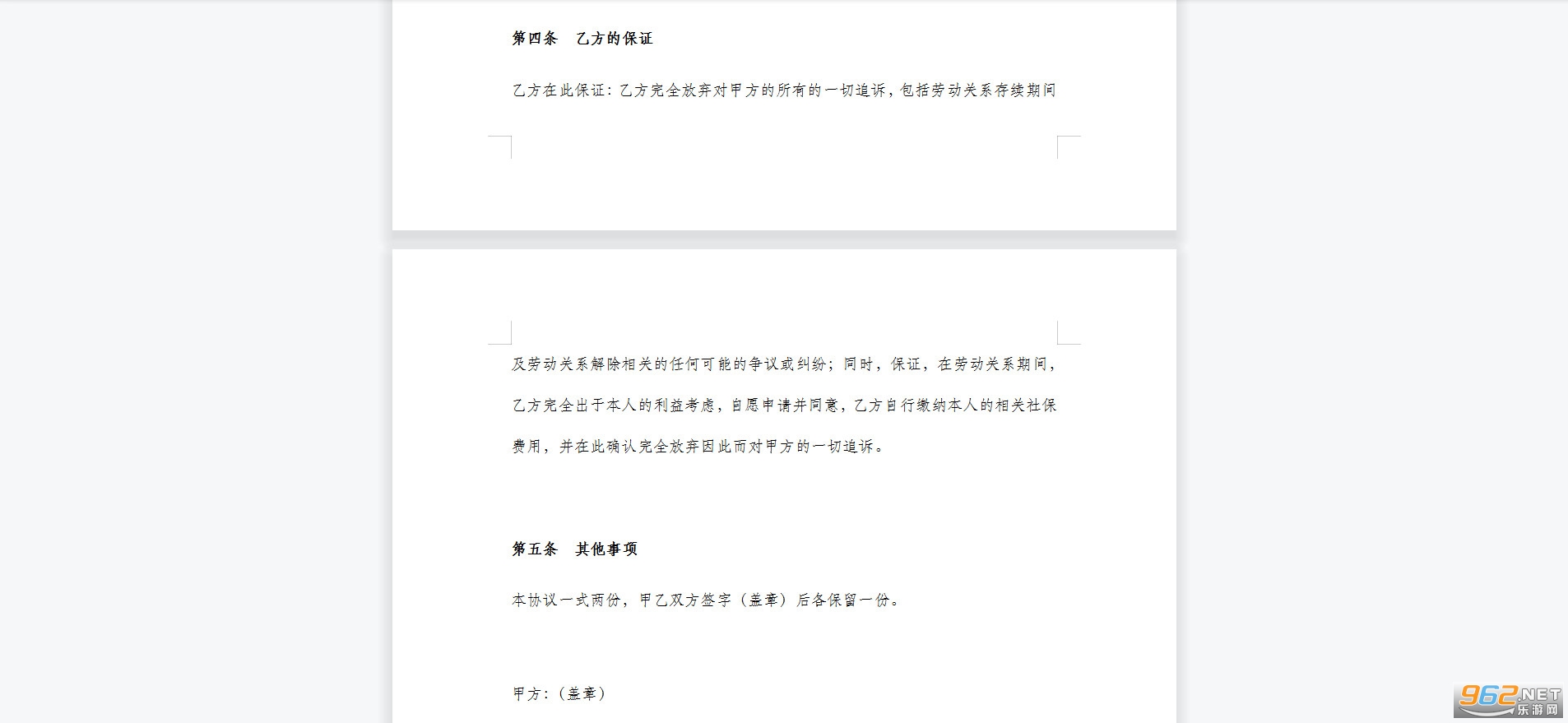 (四)从本协议甲、乙双方签字(盖章)之日起,原签署的劳动合同解除、终止。