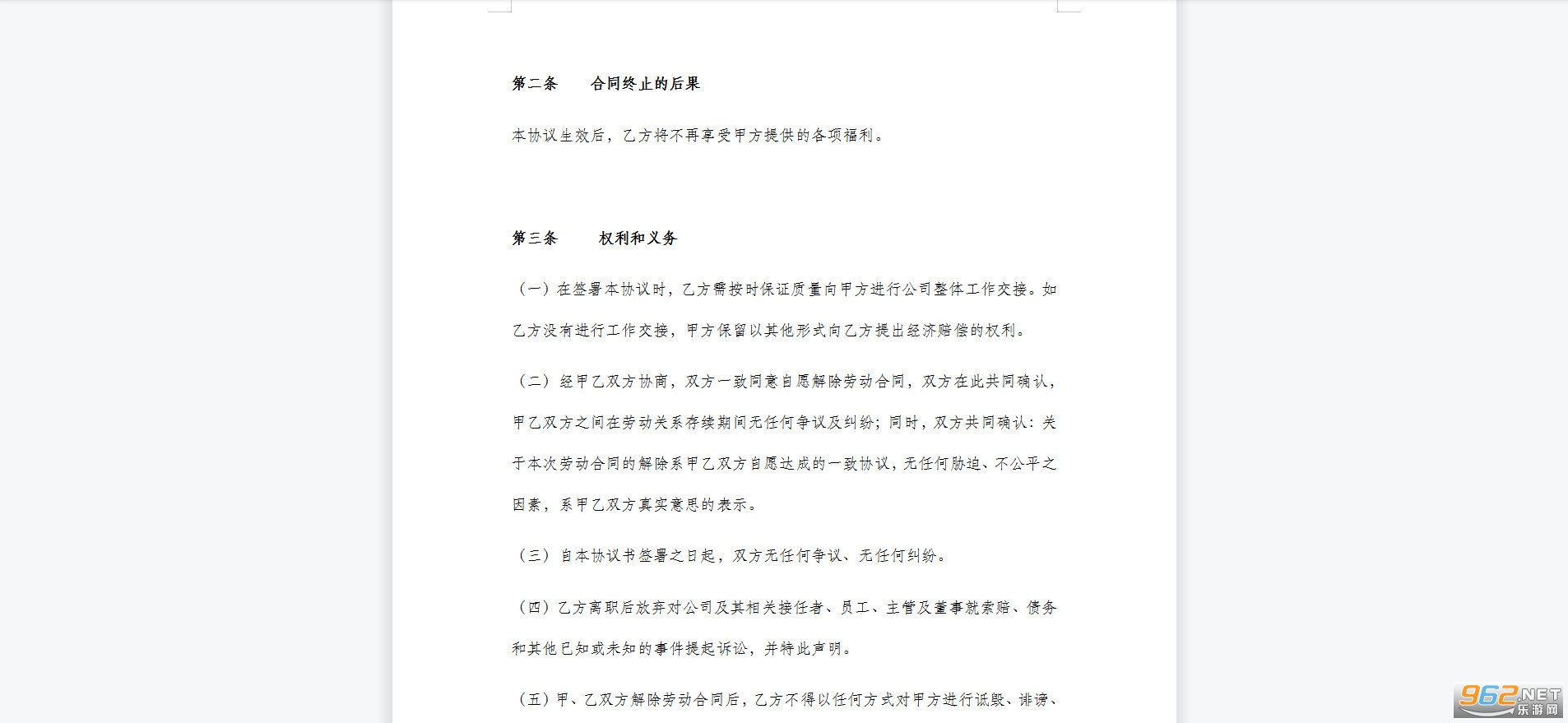 (二)经甲乙双方协商,双方一致同意自愿解除劳动合同,双方在此共同确认,甲乙双方之间在劳动关系存续期间无任何争议及纠纷;同时,双方共同确认:关于本次劳动合同的解除系甲乙双方自愿达成的一致协议,无任何胁迫、不公平之因素,系甲乙双方真实意思的表示。