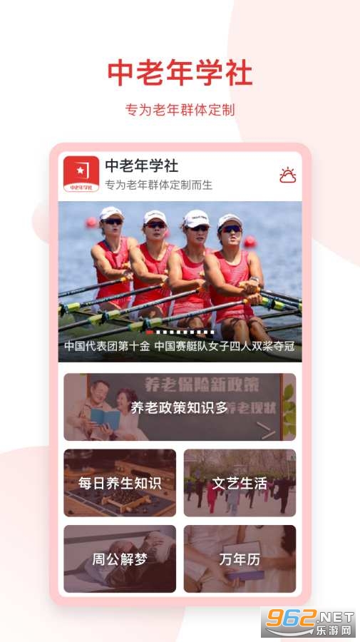 《中老年学社》是一款专为老年群体定制的老年人服务社区平台,更多养老养生问题以及更多专业急救知识,帮助老年朋友们有更美好的生活,上面会有更多文艺节目、养生知识、历史军事频道等等,内容非常丰富涵盖了老年朋友们生活的方方面面。