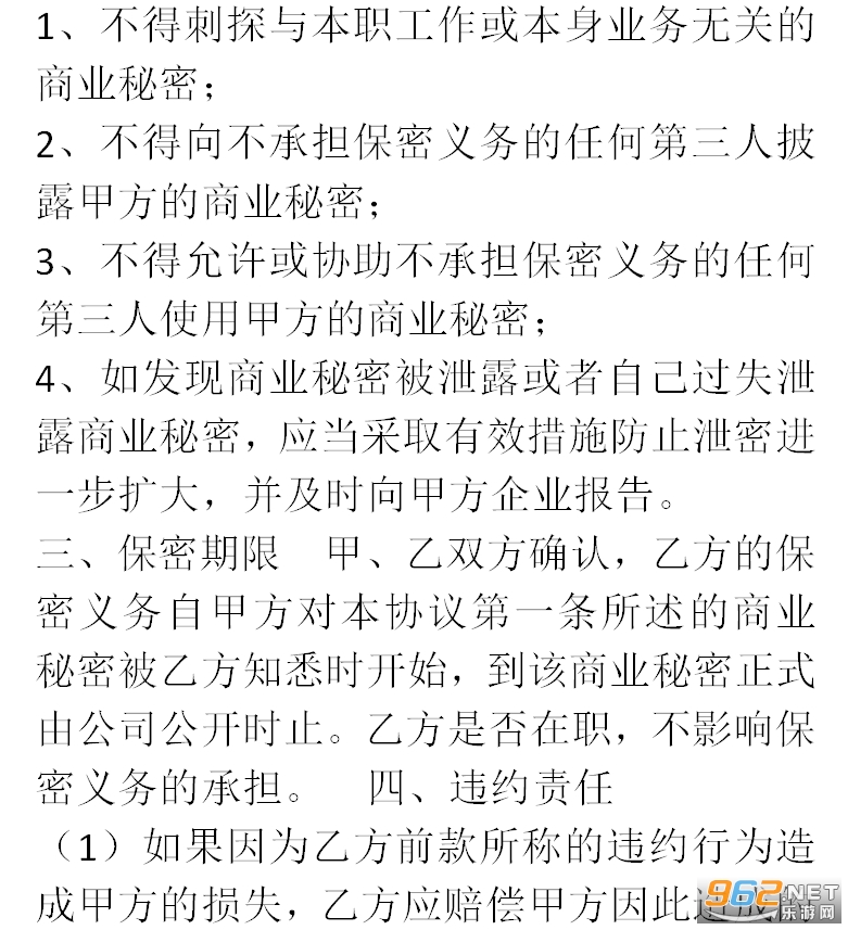 二、乙方的保密义务对第一条所称的商业秘密,乙方承担以下保密义务: